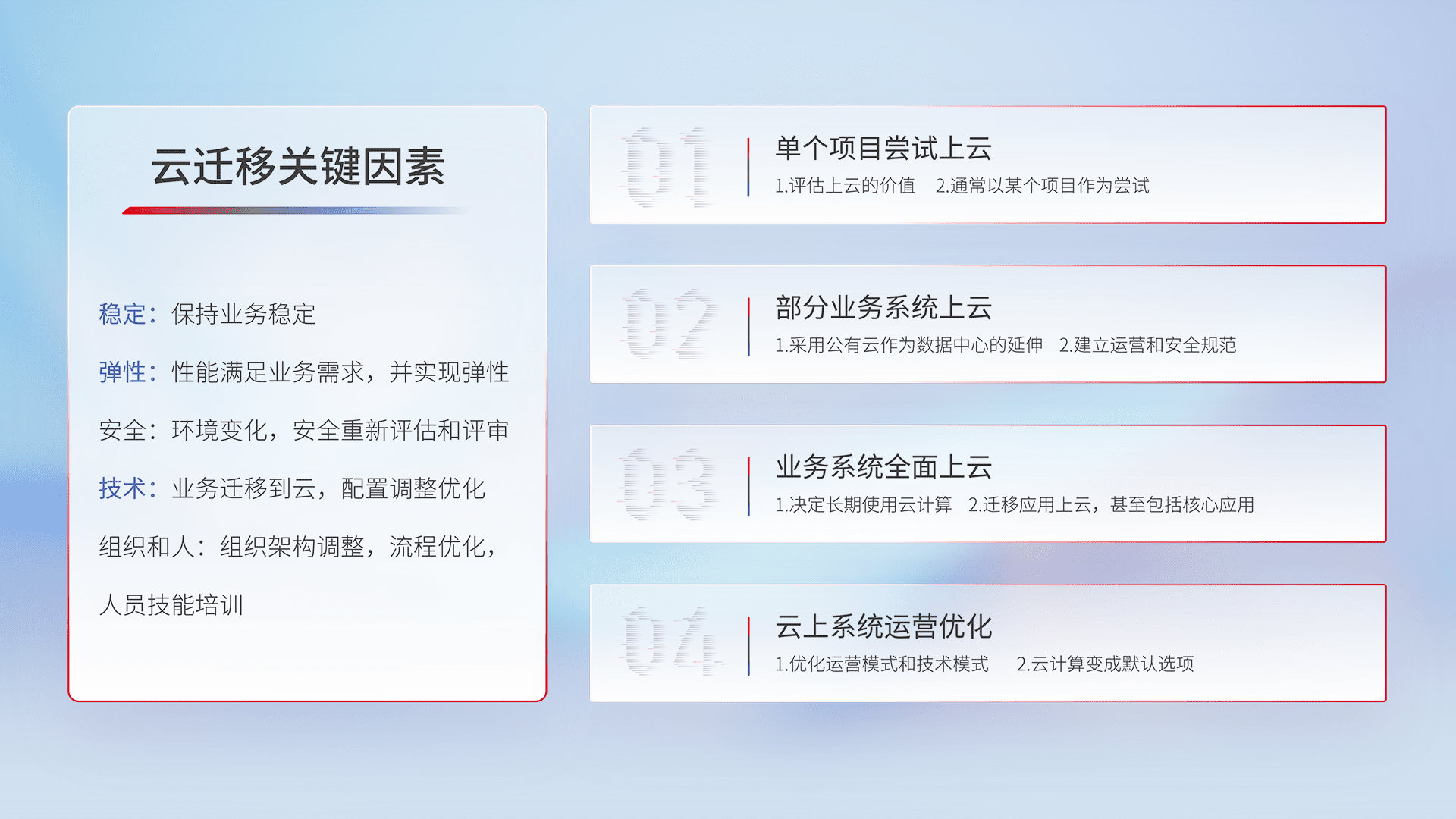 结合实际业务,,,,从规划设计、、、云平台选型、、、云原生改造、、、、数据迁移、、、集成交付,,,迁移全过程为客户识别最佳上云路径,,,,做好风险识别管理,,设计网络架构、、、、身份权限、、、安全审计合规、、、操作审计、、、日志审计、、、、监控告警策略、、、、多站点容灾设计等,,,对云上基础设施进行整体规划,,,提升IT治理水平,,,,以满足弹性、、、、高可用、、、高性能的需求。。。。