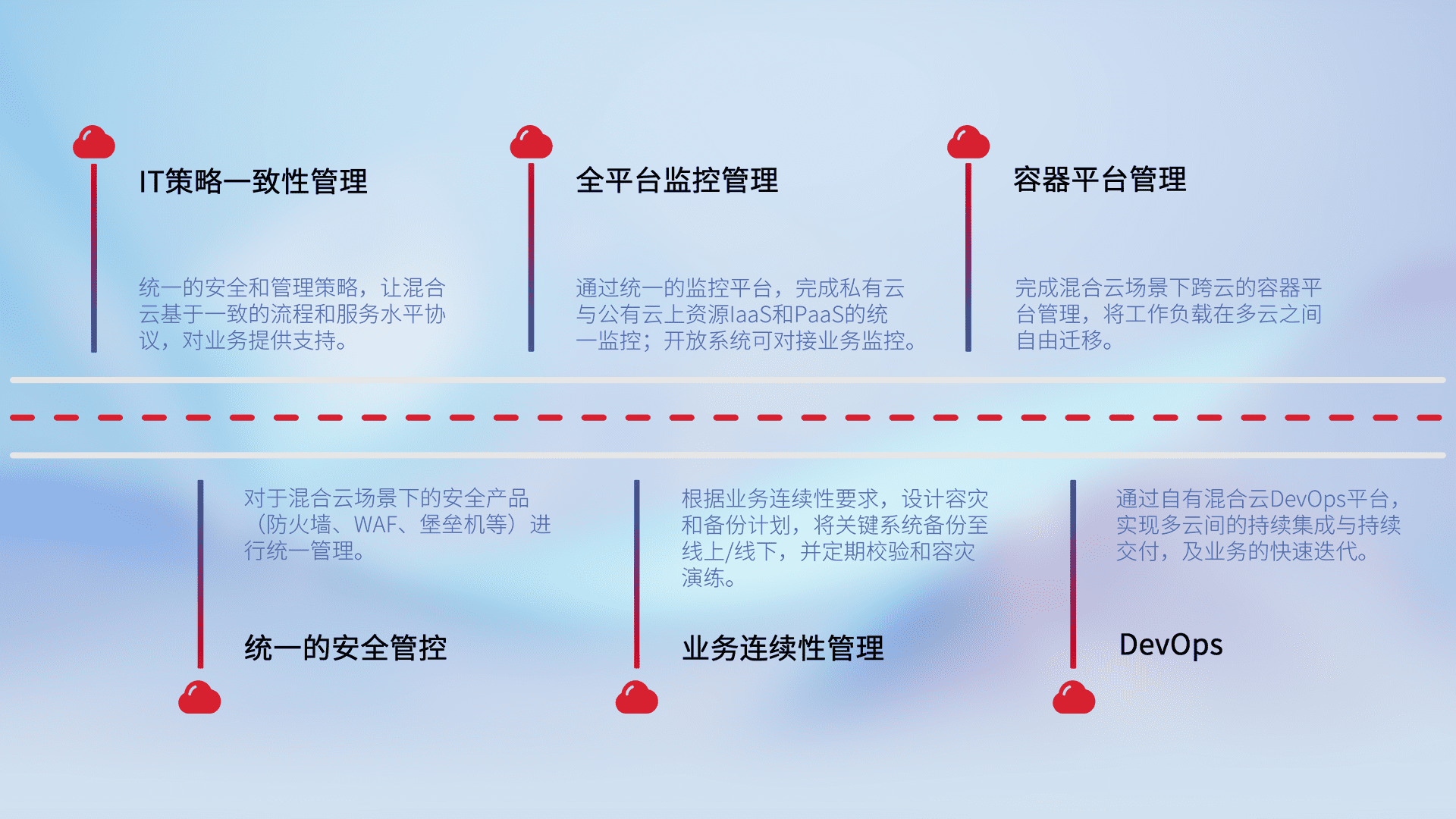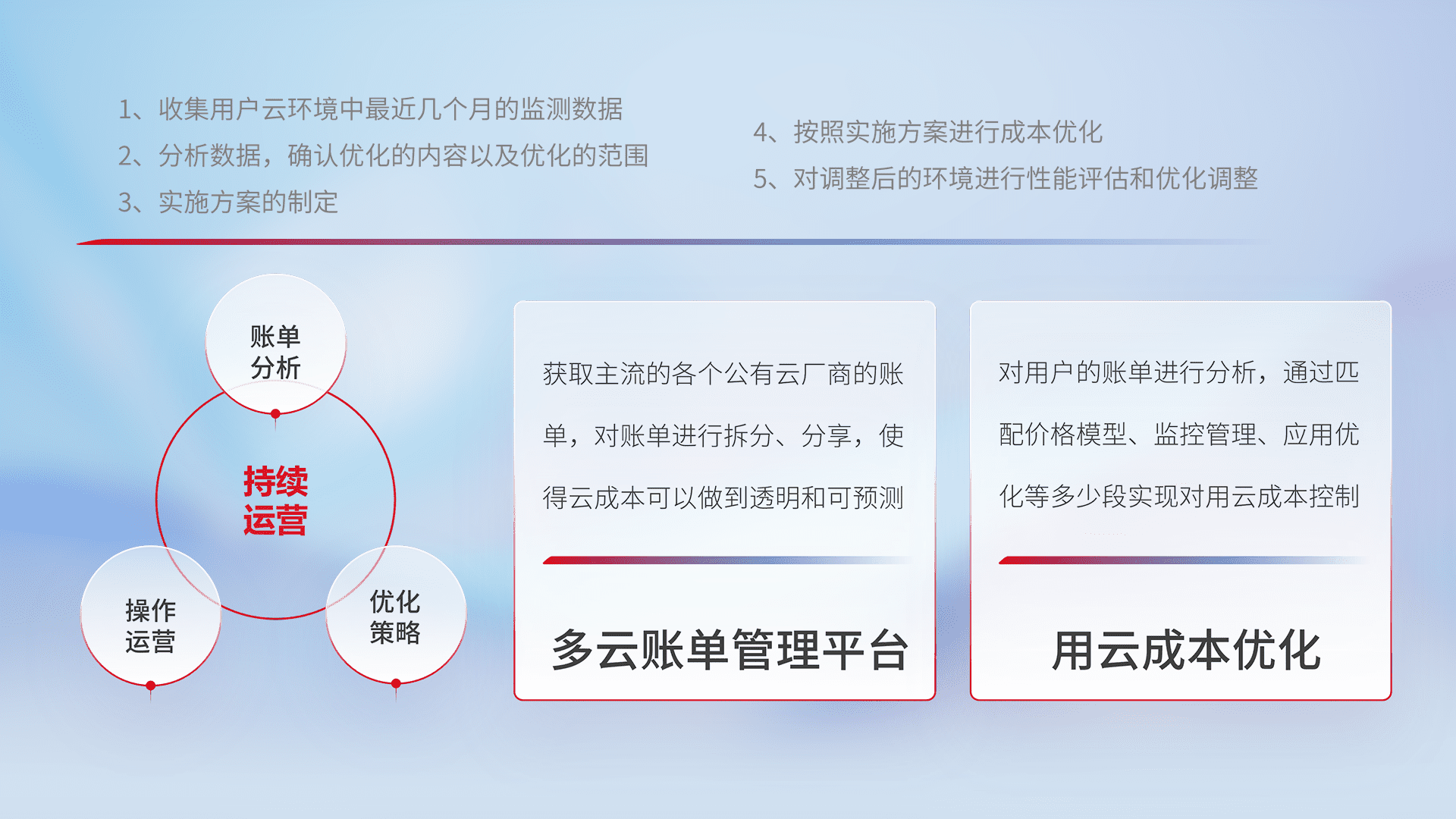 通过多云纳管,,以统一的资源数据模型把客户的云资源进行抽象和封装,,进而实现对多云资源的统一操作,,,保障云资源管理的可靠性、、、、稳定性与可用性。。量身定制化运维内容,,,,配置、、、开发运维、、补丁管理、、、备份、、、监控、、认证和访问管理、、、审计和日常巡检等,,,,保障在用云过程中的可靠度,,,,稳定度以及高可用率。。